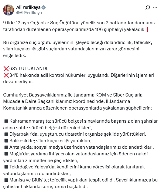 İçişleri Bakanı Ali Yerlikaya sosyal medya hesabından yaptığı paylaşımda, 9 ilde 12 ayrı organize suç örgütüne yönelik son 2 haftadır jandarma ekiplerince düzenlenen operasyonlarda 106 şüpheliyi yakaladıklarını açıkladı.