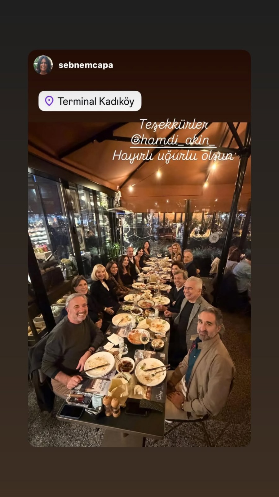 16 kişinin bulunduğu masada yer alan Şebnem Çapa, paylaştığı videolara “Bu akşam müthiş bir yere geldik. Sevgili Hamdi Akın’ın yarattığı tüm street food lezzetlerinin olduğu harika bir nokta. İnsan ne yiyeceğini şaşırır. Mutlaka görmenizi ve bu lezzetleri tatmanızı tavsiye ederim. Hakikaten yok yok. Buranın harika bir ismi var: Yedideyediterminal. Teşekkürler Hamdi Akın. Hayırlı uğurlu olsun” notunu yazdı.